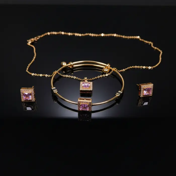 - Elevate your style with this exquisite gold-plated jewelry set, featuring dazzling square-cut pink stones.This elegant set includes a matching necklace, bracelet, and earrings, perfect for adding a touch of sophistication to any outfit. Ideal for parties, special occasions, or daily wear. High-quality craftsmanship ensures lasting shine and comfort. A perfect gift for her!