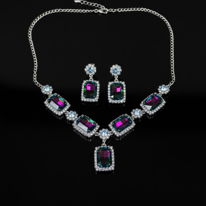 Adorn yourself with this exquisite multi-color stone jewelry set, featuring a stunning necklace and matching earrings. Each piece showcases large, rectangular iridescent stones framed by sparkling clear crystals, creating a captivating shimmer. Perfect for special occasions, parties, weddings, or as a glamorous gift. High-quality craftsmanship ensures lasting beauty and comfort. Elevate your style with this elegant statement piece.