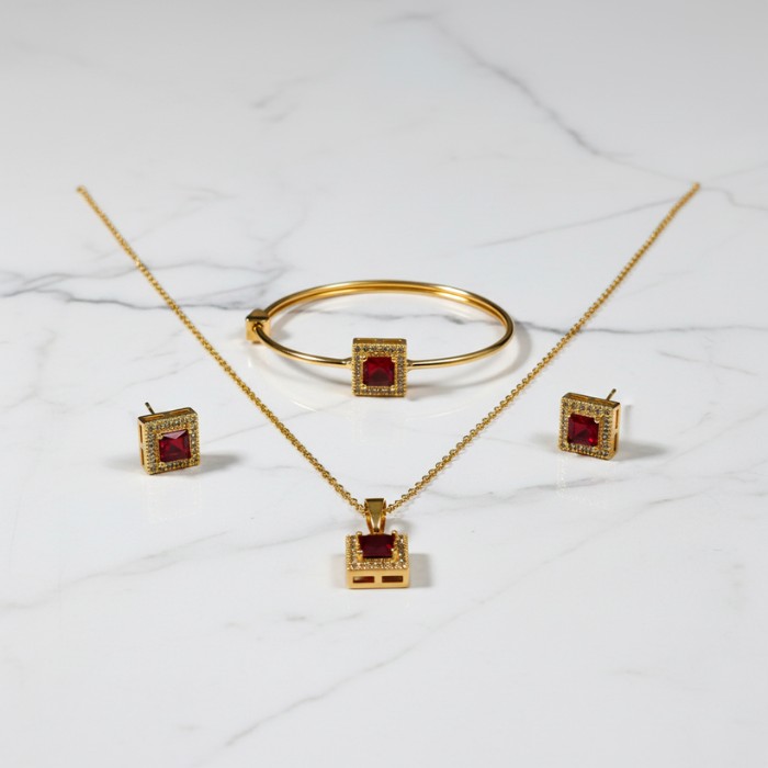 - Elevate your style with this exquisite gold-plated jewelry set, featuring a stunning pendant necklace, matching earrings, and a chic bracelet.Each piece is adorned with vibrant ruby-colored stones and sparkling cubic zirconia accents, creating a luxurious and eye-catching look. Crafted for durability and everyday wear, this set is perfect for special occasions or adding a touch of glamour to your daily ensemble. A perfect gift for loved ones or a treat for yourself!