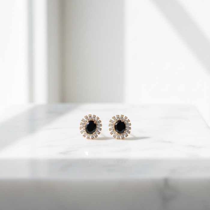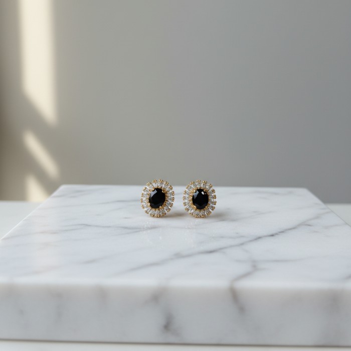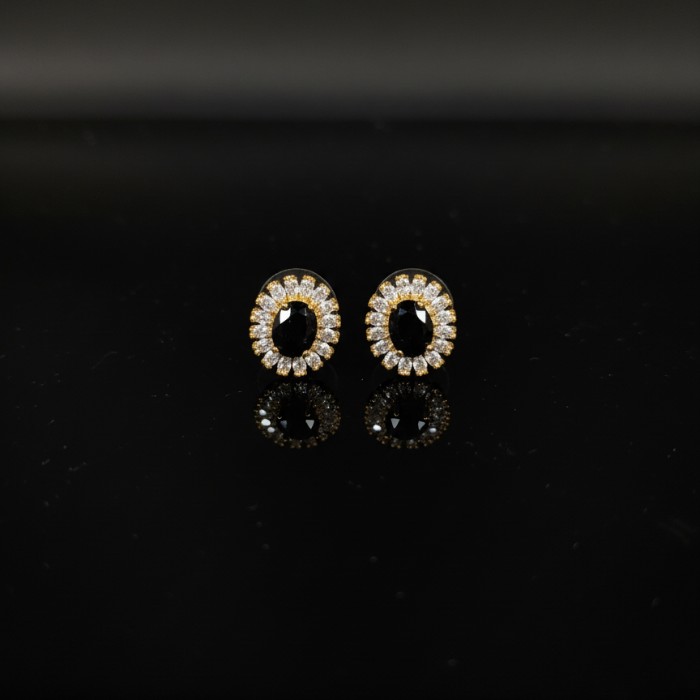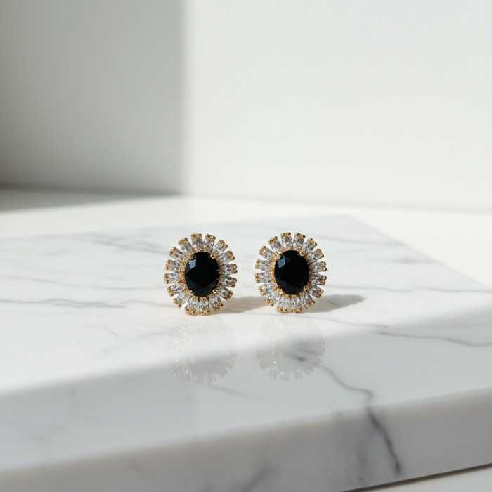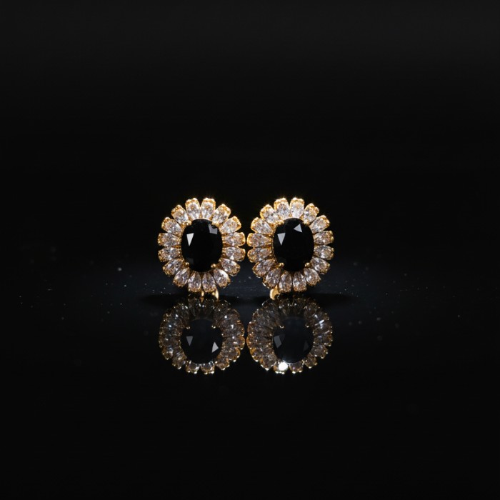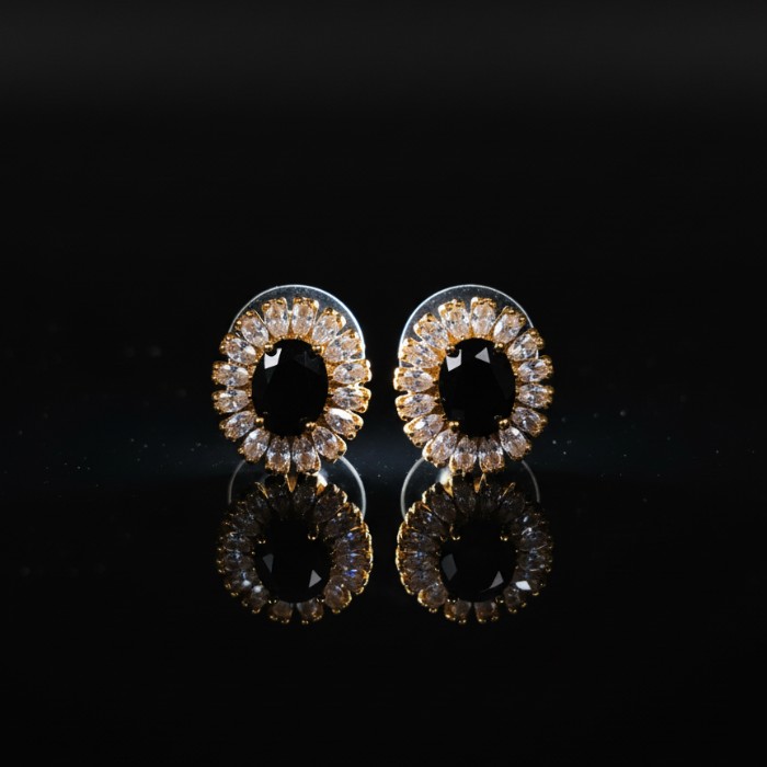 - Elevate your style with these stunning Black Onyx and Cubic Zirconia stud earrings. Featuring a central black onyx stone surrounded by sparkling cubic zirconia, set in a radiant gold-plated design. Perfect for parties, special occasions, or adding a touch of glamour to your everyday look. These elegant earrings are a must-have addition to any jewelry collection.