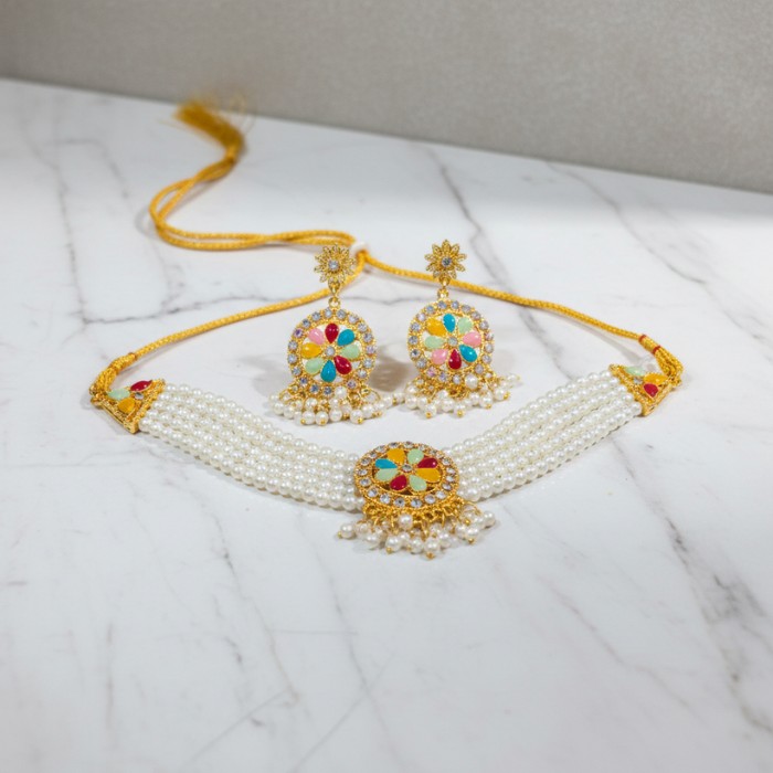 Elegant Pearl & Kundan Choker Necklace Set with Earrings - Sky Blue & White