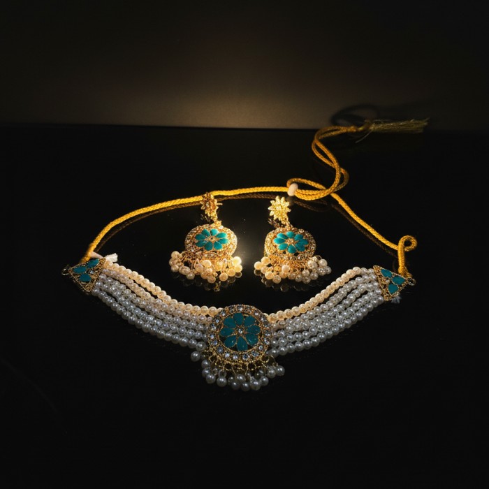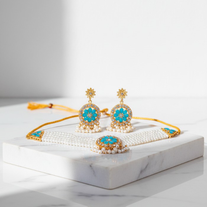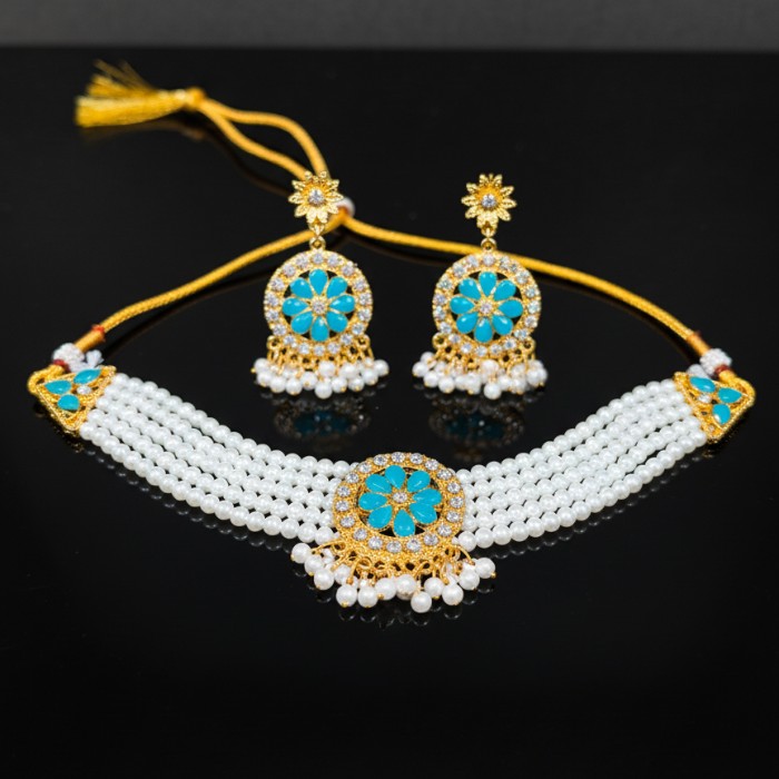 Be the first to review “Elegant Pearl & Kundan Choker Necklace Set with Earrings – Sky Blue & White ” Cancel reply