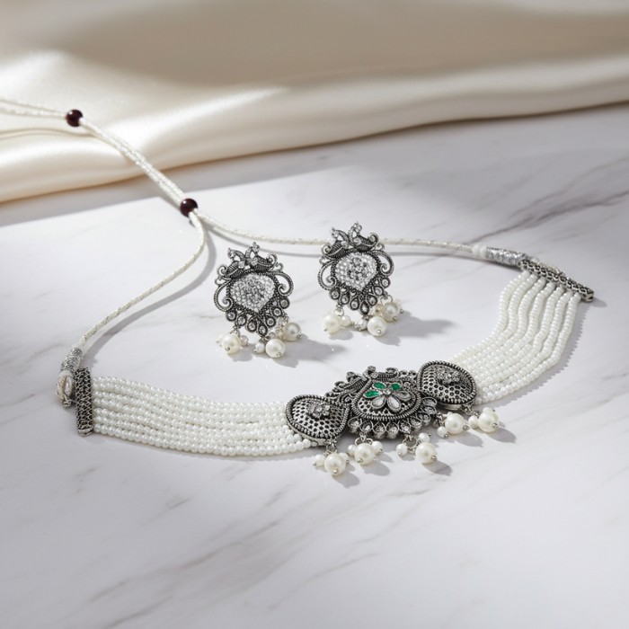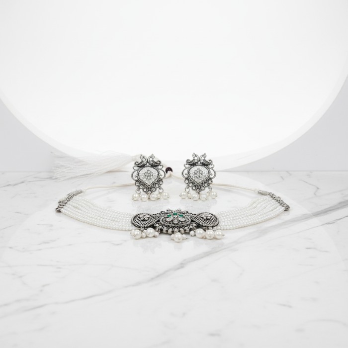 Sonerri Oxidized Silver Choker Necklace Set with White Pearls & Matching Earrings