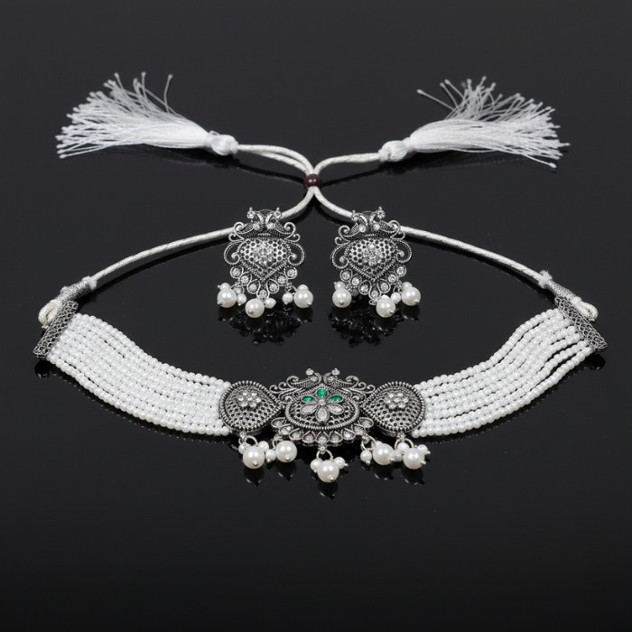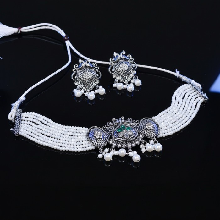- Enhance your ethnic or contemporary look with this exquisite oxidized silver choker necklace set.Featuring intricate detailing on the pendant and matching earrings, adorned with delicate white beads, this set adds a touch of traditional elegance. Perfect for parties, weddings, or festive occasions, it’s a versatile accessory to elevate any outfit.