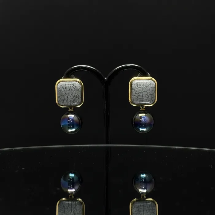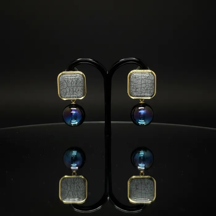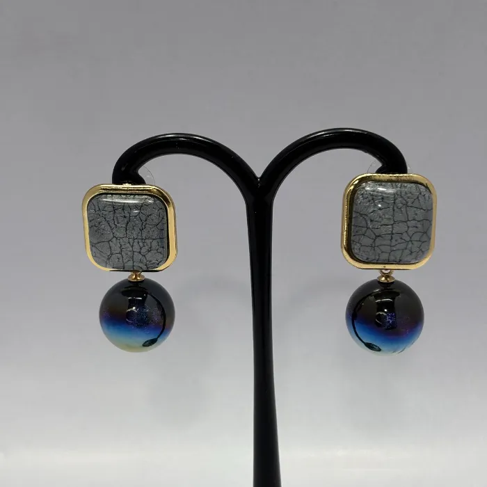 Unique square, cracked grey resin stud earrings with a stunning oil-slick, iridescent blue/purple orb drop. Make a bold, modern statement.