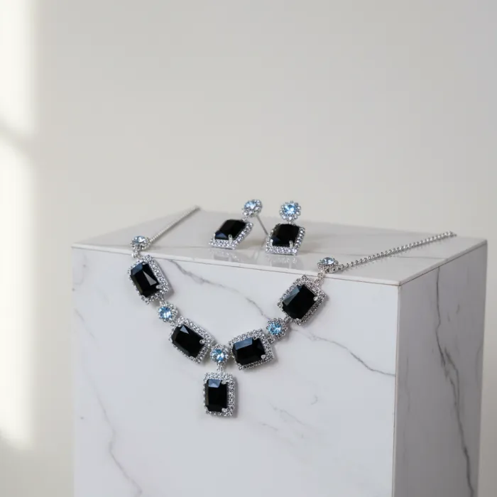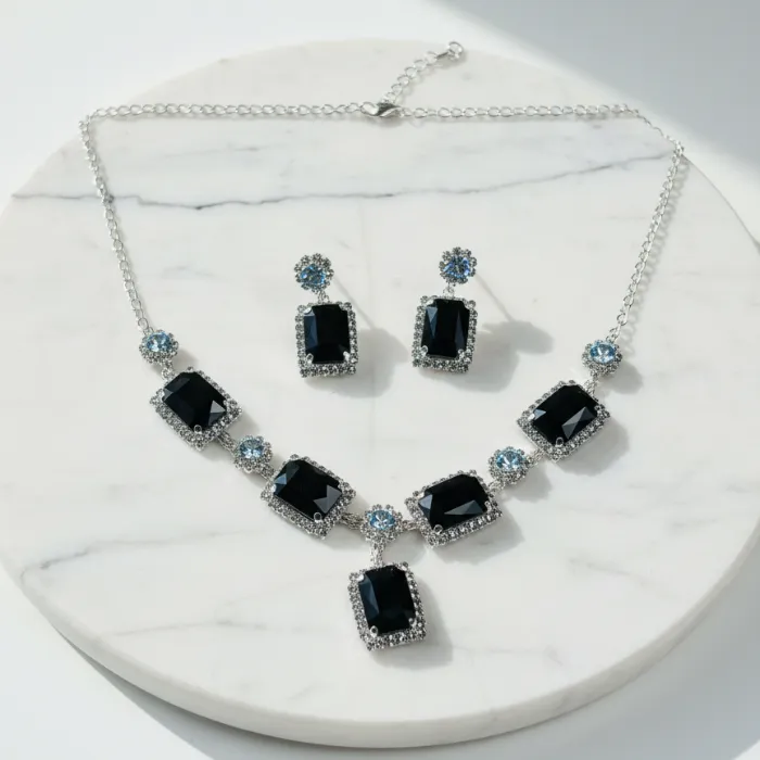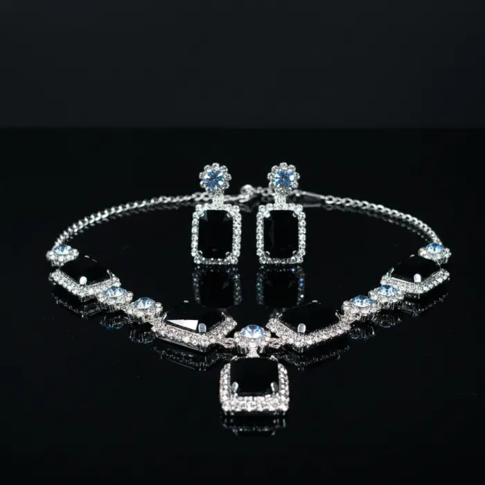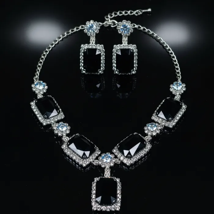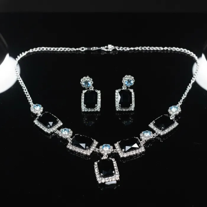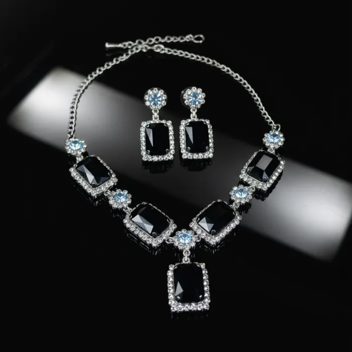 This exquisite black choker necklace set features dazzling black stones surrounded by sparkling accents, creating a luxurious and eye-catching look