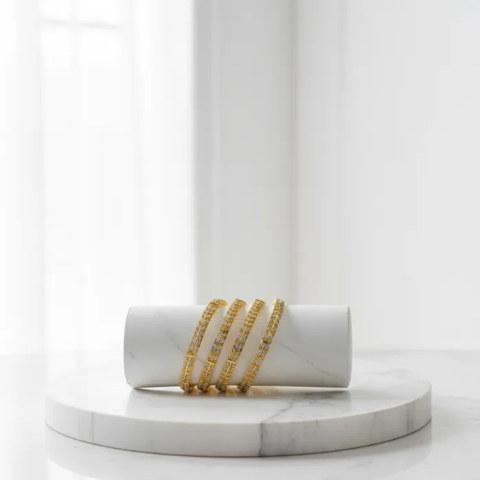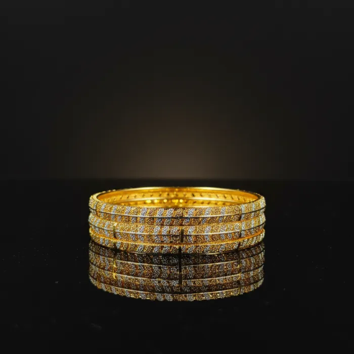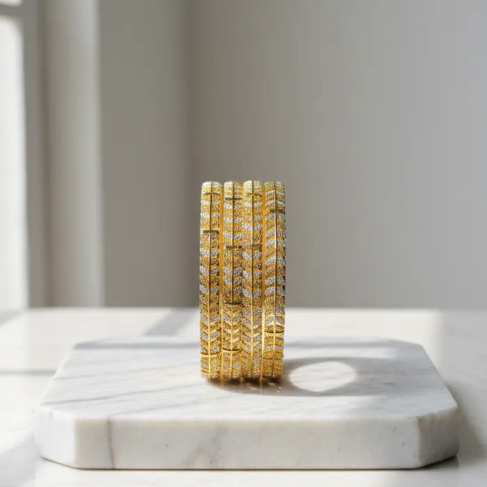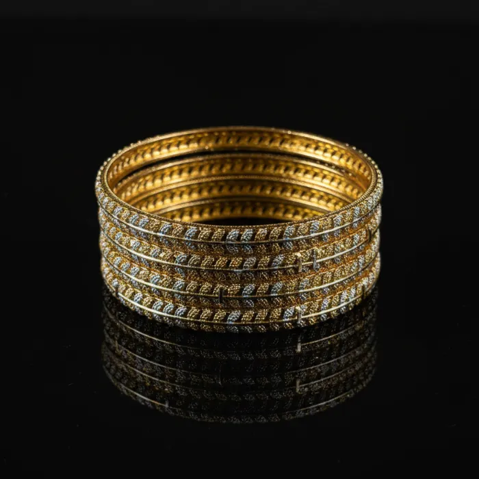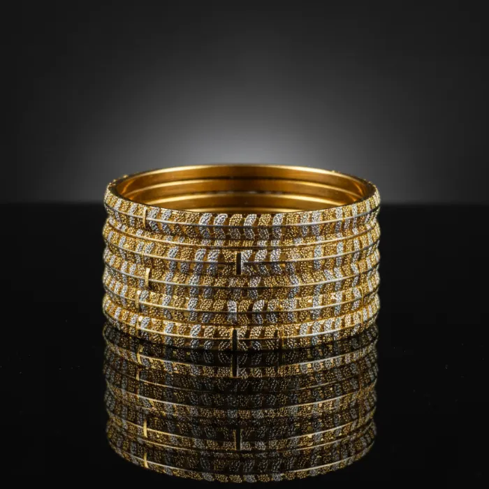 Elevate your style with this stunning set of gold-plated bangles, perfect for traditional Indian occasions or adding a touch of elegance to any outfit. Crafted with intricate details and a durable finish, these bangles offer a blend of classic charm and modern appeal. Ideal for daily wear or special events.