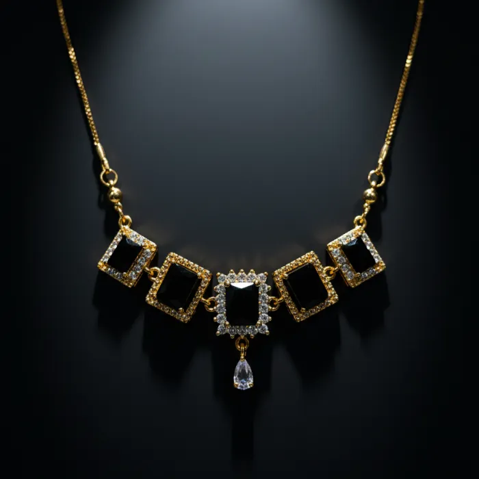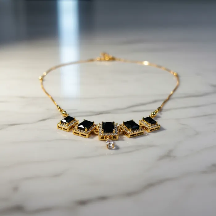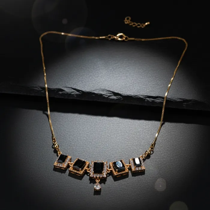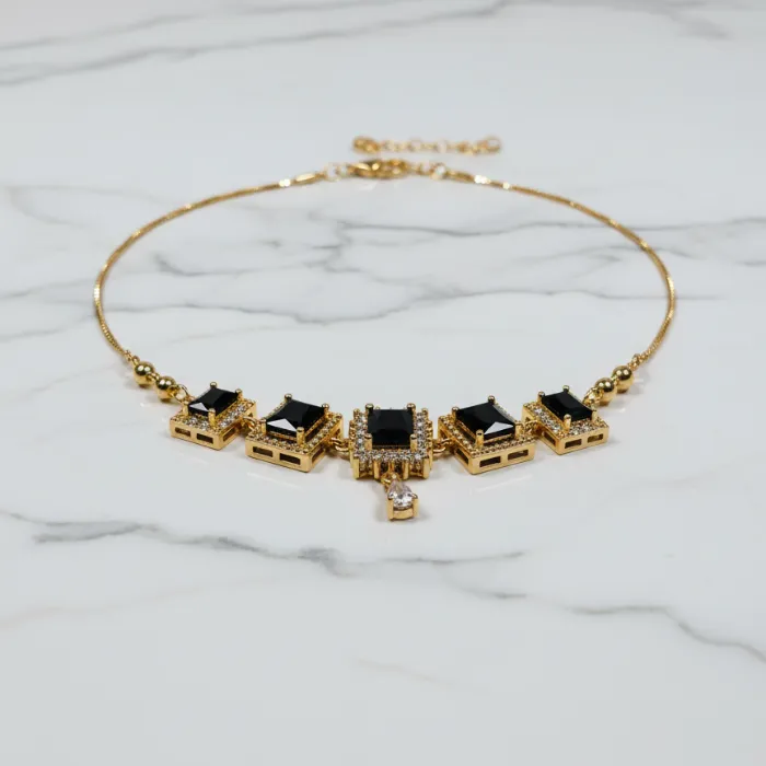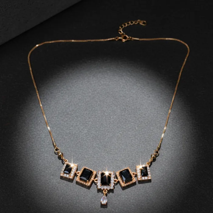Discover this stunning gold-plated necklace featuring multiple square-cut black stones, reminiscent of onyx, accented with sparkling cubic zirconia. This elegant piece adds a touch of sophistication to any outfit, perfect for special occasions or everyday glamour.
