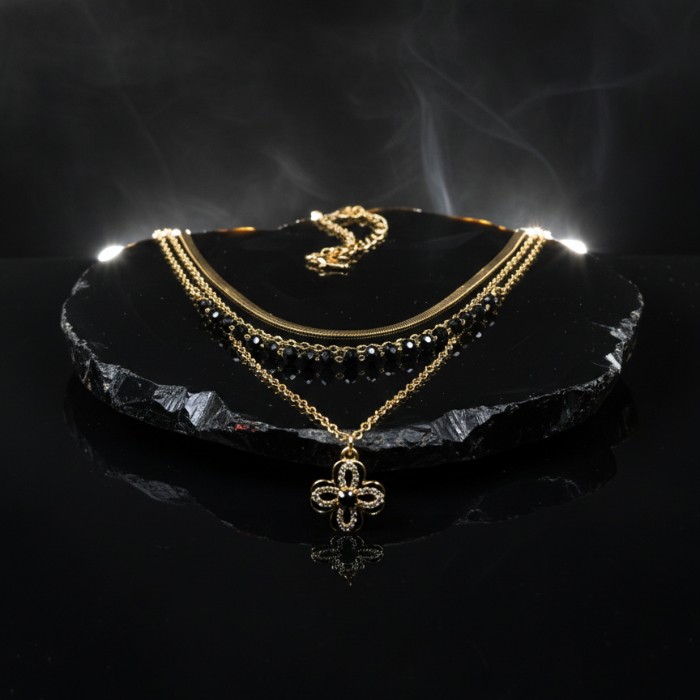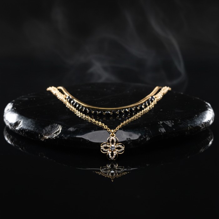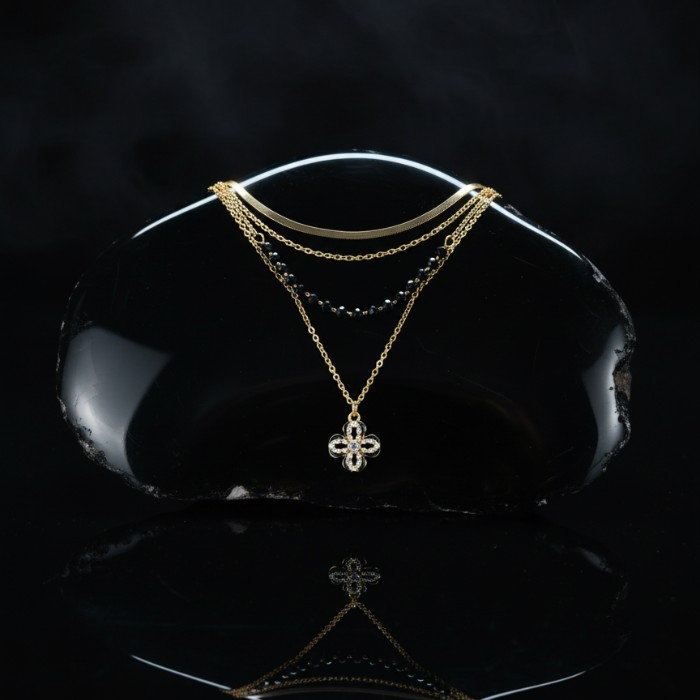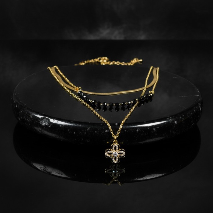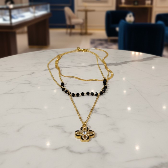 Elevate your style with this exquisite layered gold-plated necklace, featuring delicate chains, lustrous black beads, and a charming four-leaf clover pendant. Perfect for adding a touch of sophistication to any outfit, from casual wear to special occasions. A versatile piece for women who appreciate timeless elegance.