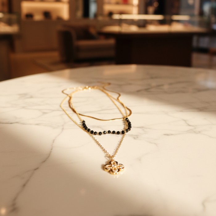 Elegant Layered Gold Chain Necklace with Black Beads & Clover Pendant – Women’s Fashion Jewelry