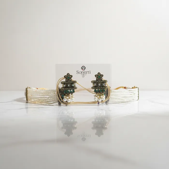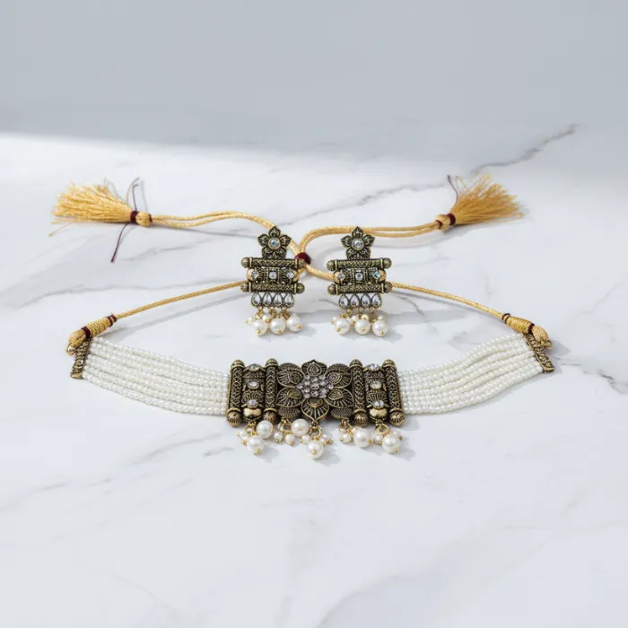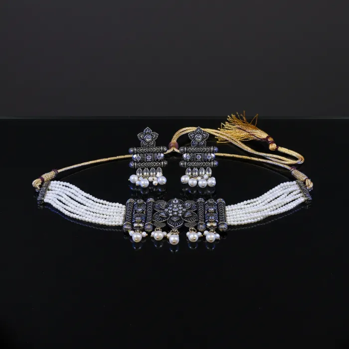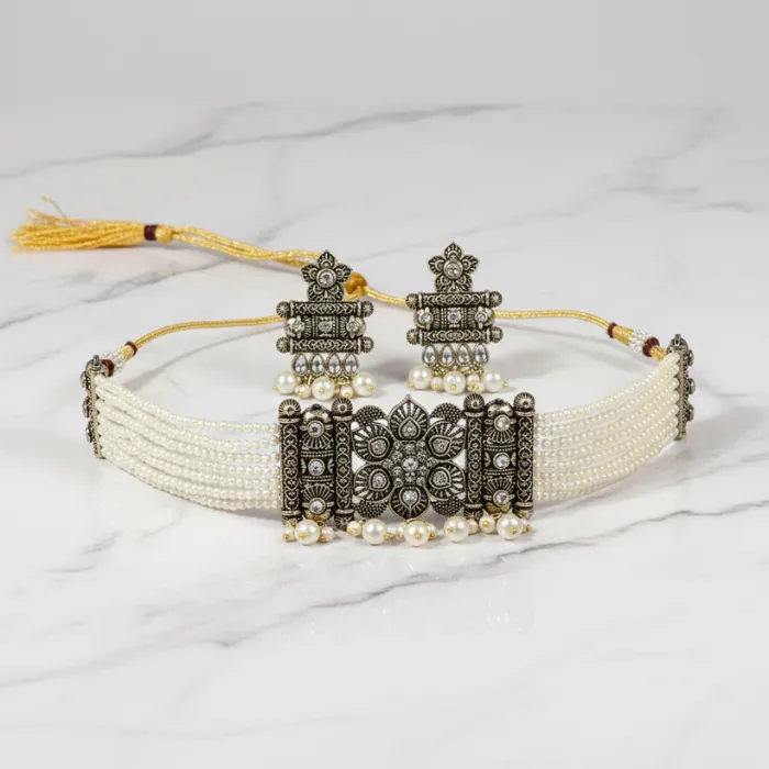 Elegant Pearl & Oxidized Choker Necklace Set with Matching Earrings