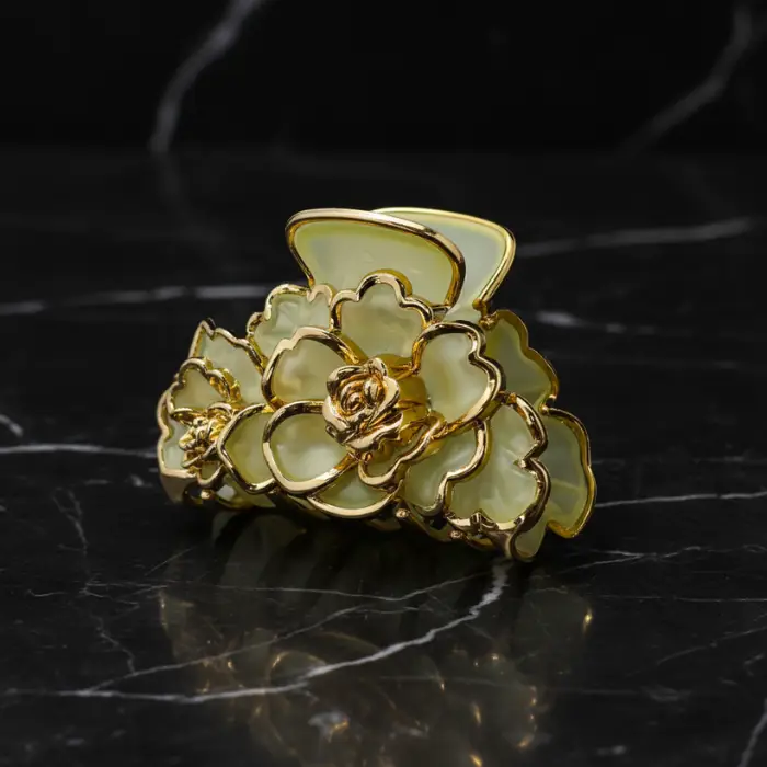 Achieve ethereal beauty with this stunning hair claw, designed specifically to secure voluminous updos with grace. The beautiful contrast between the soft, luminous petals and the polished golden framework adds a touch of royal sophistication to any wedding attire. A timeless piece of hair art.