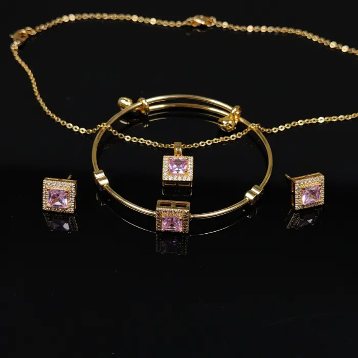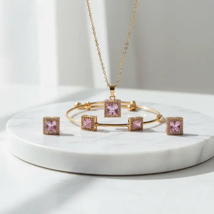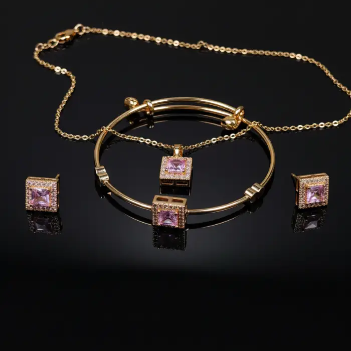 - Elevate your style with this exquisite gold-plated jewelry set, featuring dazzling square-cut pink stones.This elegant set includes a matching necklace, bracelet, and earrings, perfect for adding a touch of sophistication to any outfit. Ideal for parties, special occasions, or daily wear. High-quality craftsmanship ensures lasting shine and comfort. A perfect gift for her!