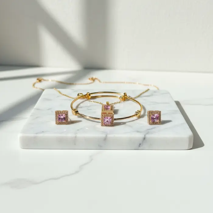 Gold Plated Square Pink Stone Jewelry Set for Women | Necklace, Bracelet & Earrings
