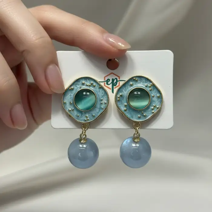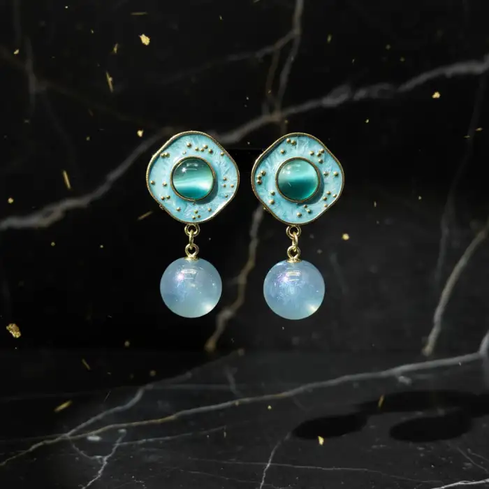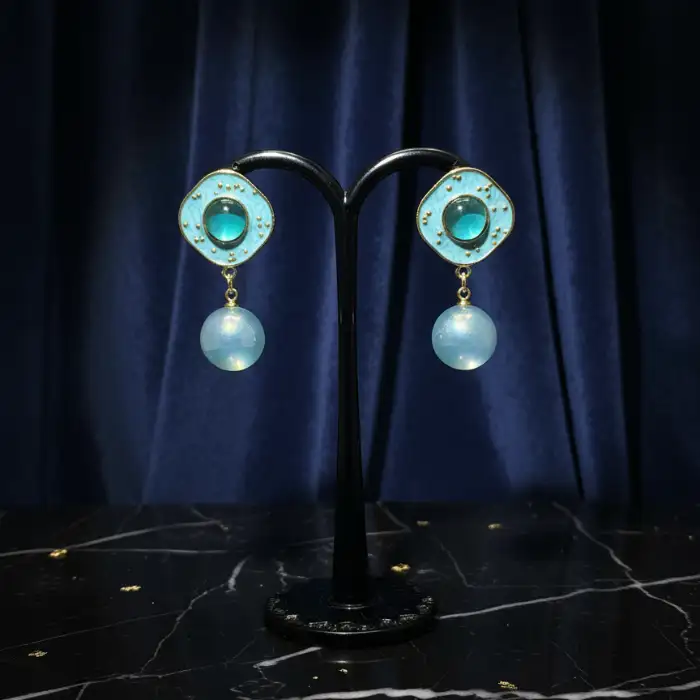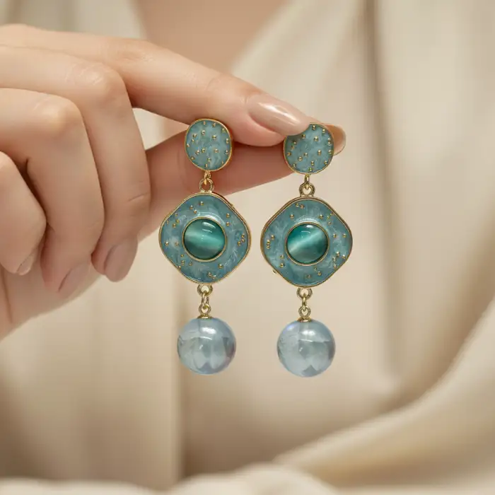 Inspired by royal heritage, these earrings symbolize grace and high status. The combination of the structured square base and the flowing stone-encrusted frame creates a majestic aesthetic for your upscale wardrobe.