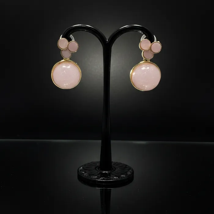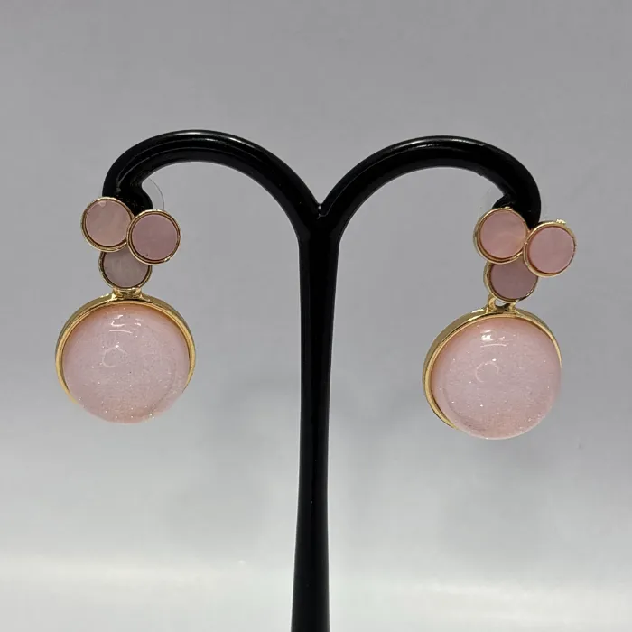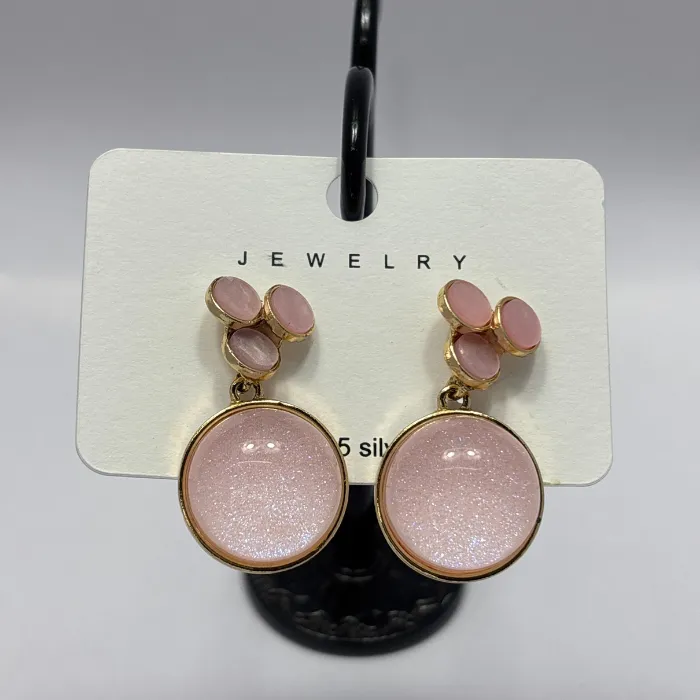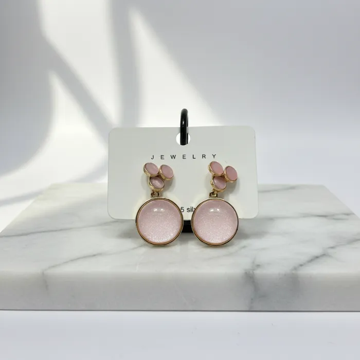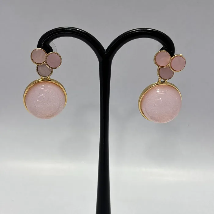 Elegant and light-catching pink jewelry, perfect for bridesmaids or special occasions. Features a multi-stone stud and a glossy, glittery circle.