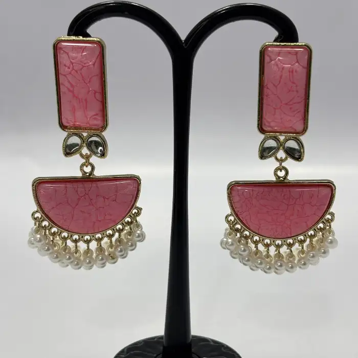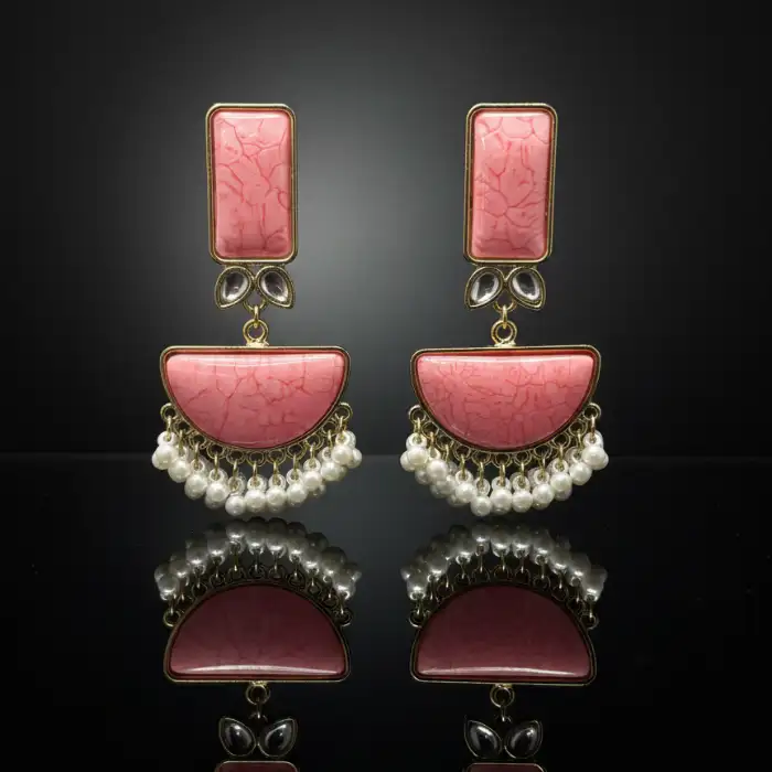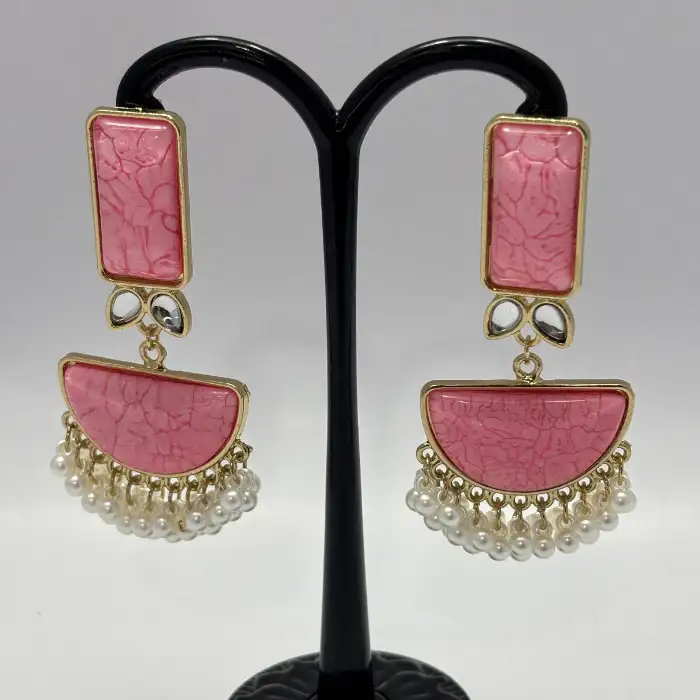 Bold dangle earrings featuring a rectangular pink crackle resin stud and a half-moon drop with delicate, cascading white mini pearl tassels. Vintage-inspired glam.