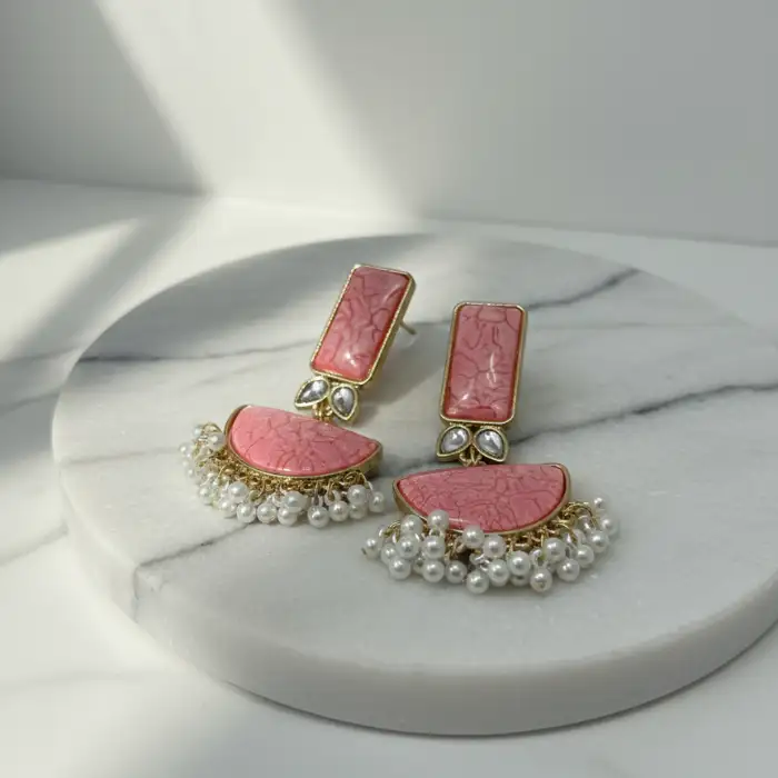 Pink Cracked Resin & Mini Pearl Tassel Earrings