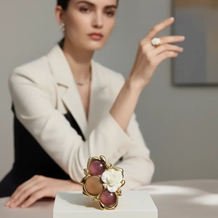 An elegant, ethnic-inspired piece featuring deep black onyx-style stones surrounded by brilliant white crystals. Its substantial design pairs beautifully with traditional sarees, particularly complementing gold Jhumka earrings.