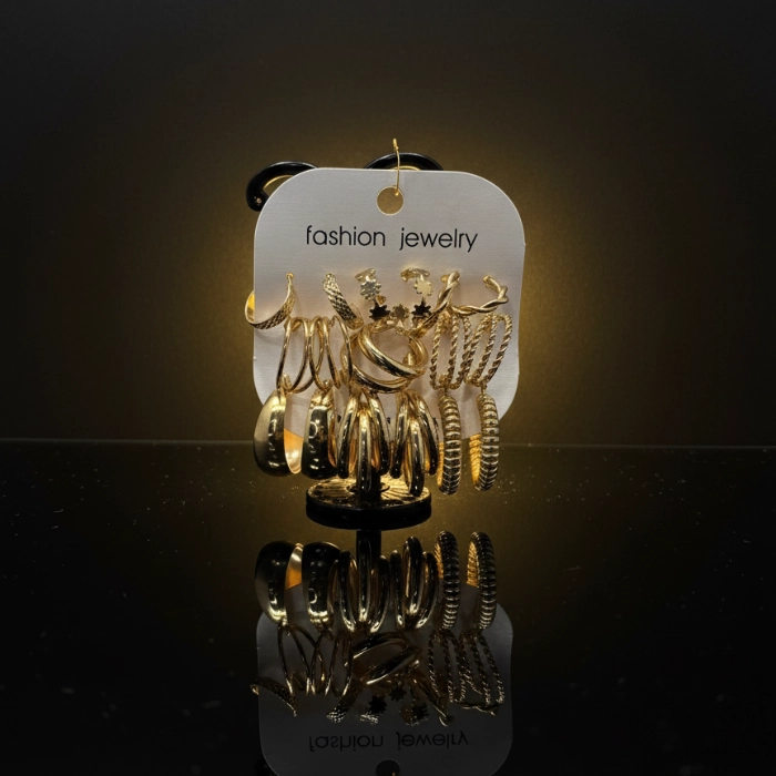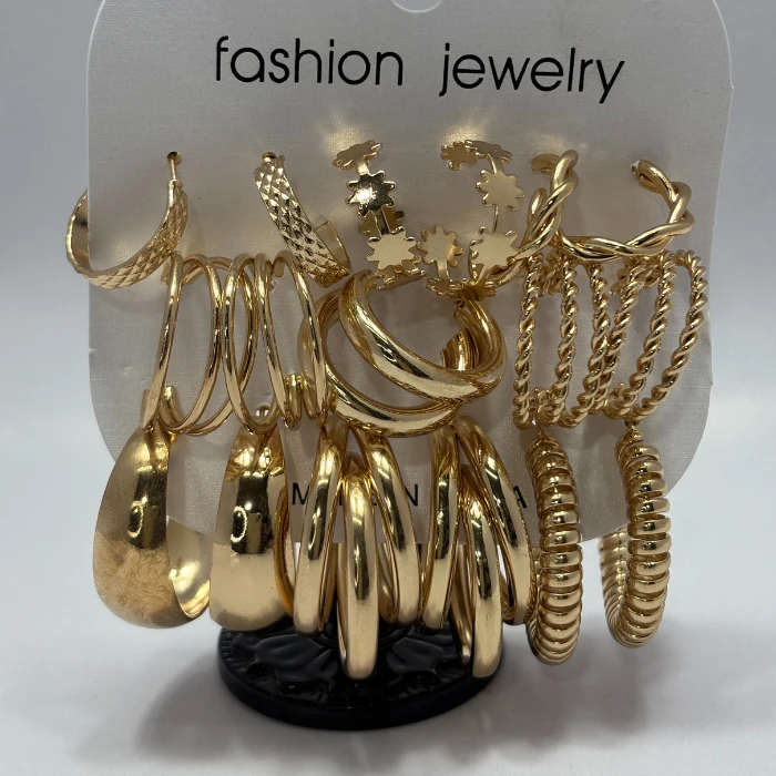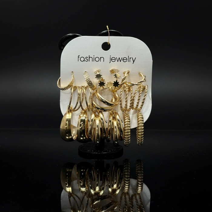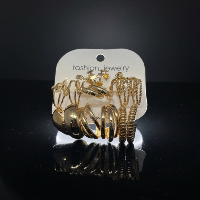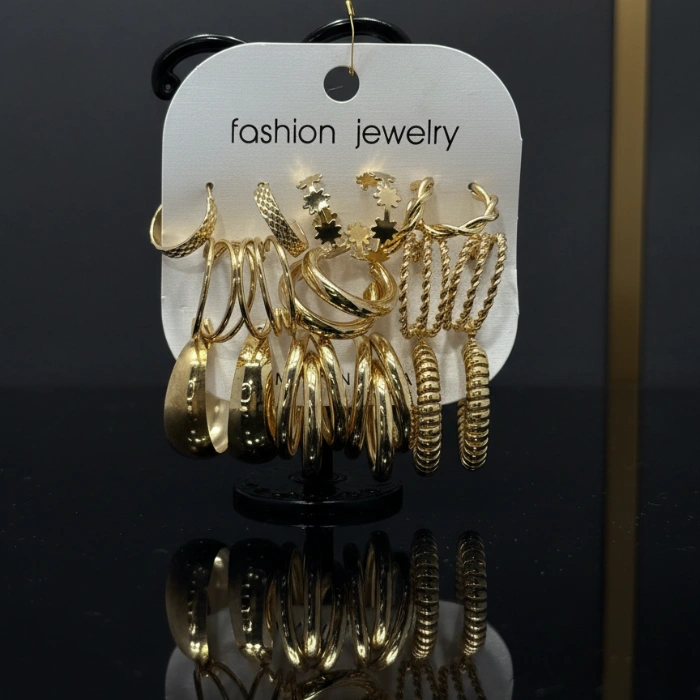 Get instant style with this versatile 9-pack of gold earrings. Mix of large statement hoops, small accent pieces, and textural designs for every occasion.
