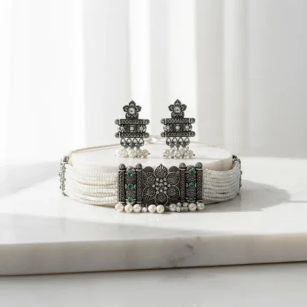 Sonerri Oxidized Silver Choker Necklace Set with White Pearls & Matching Earrings